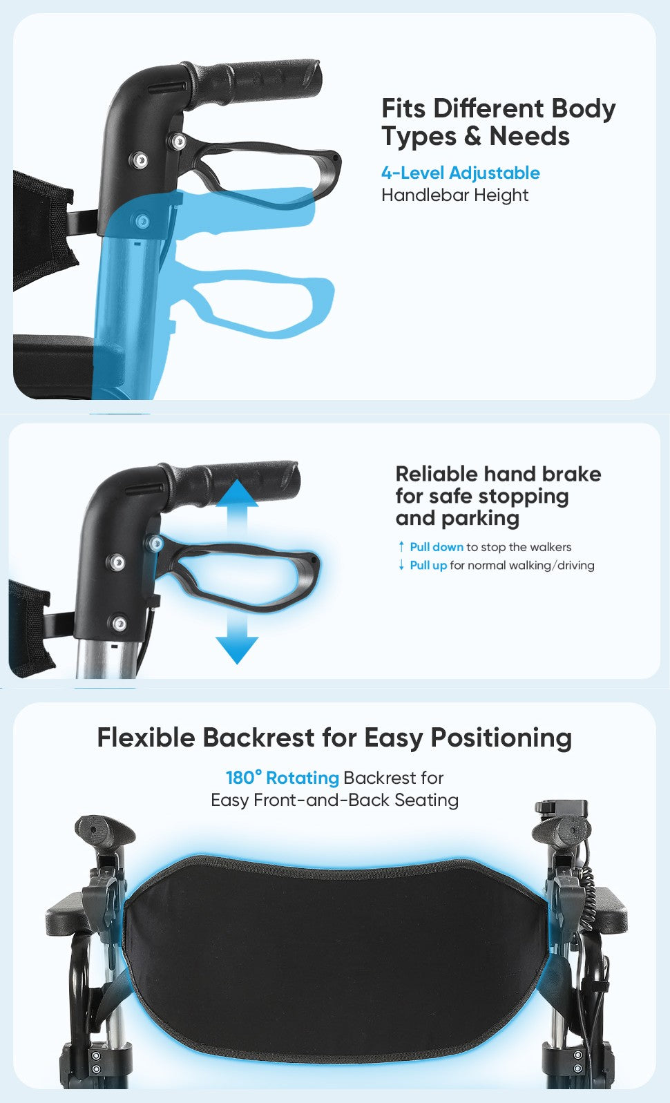 The EW6001 4-in-1 Wheelchair Rollator Walker Combo is designed for users who need flexible mobility without switching between multiple devices. It combines electric wheelchair functionality with rollator walking support, assisted pushing, transport mode, and a built-in seat for rest — all in one compact design.